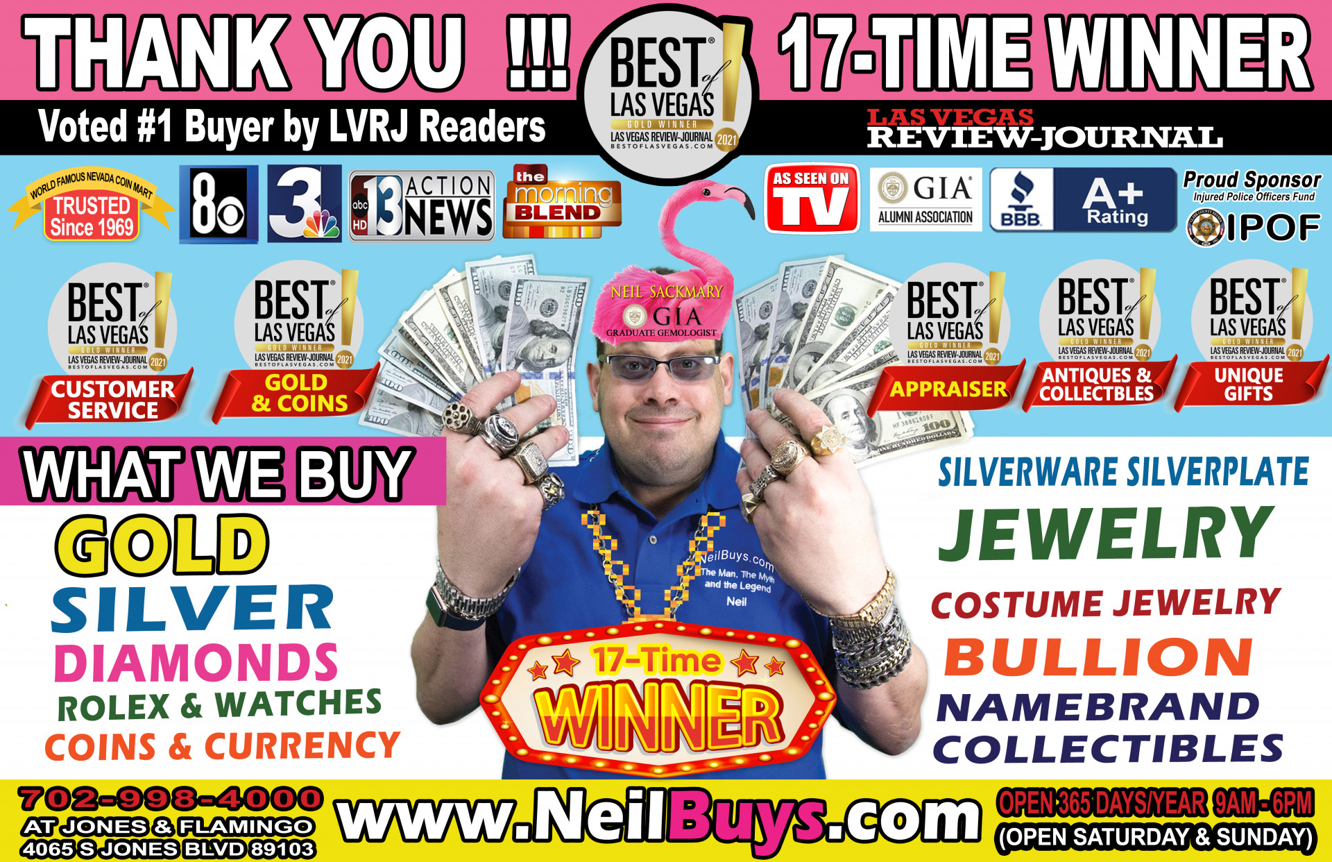 Since 1969, Nevada Coin Mart has been the #1 buyer of coins, bullion, silver & gold. We now also are the largest jewelry, costume jewelry, ROLEX, and diamond buyers in Las Vegas. Insta